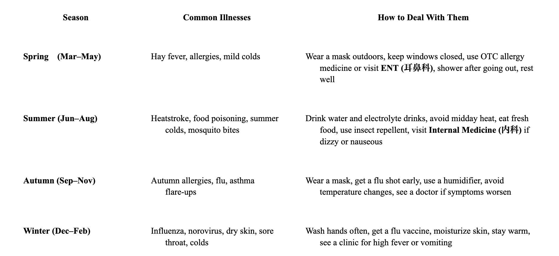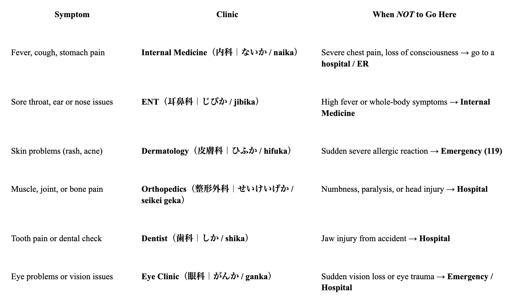 If you’re unsure which clinic to visit, Internal Medicine(内科 / naika) is usually a safe first choice. They can examine you and refer you to the right specialist if needed.