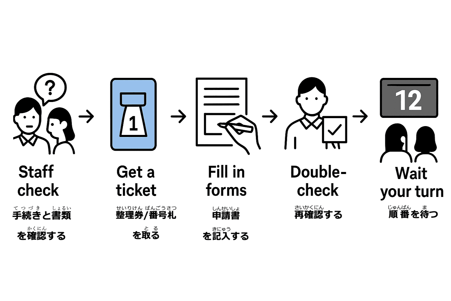 - Staff check – The staff will ask what procedures (手続き, tetsuzuki) you would like to do, what documents (書類, shorui) you brought and guide you to the next steps.